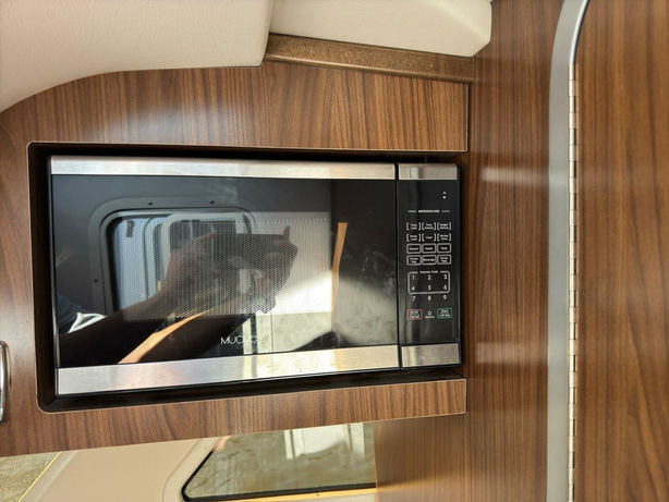 The cockpit galley is equipped for convenience and enjoyment, featuring a refrigerator, stovetop grill, microwave, and sink—perfect for preparing meals or refreshments on the water. Climate control is provided by a 12k BTU air conditioning and heating system, ensuring year-round comfort.